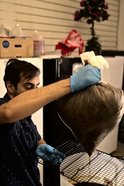 It seems as if after three days of being down he has an inspiration and knows exactly what to do next – like a phoenix from the ashes he gets up, his mind is suddenly very clear and immediately he comes into action. "I was a wreck for three days. Then I picked myself up and forged a plan," he describes soberly, as if this were completely self-evident. He slowly squeezes out the approximately two-and-a-half kilo coffee grounds over a sieve that lies on a larger container: The brown shimmering coffee concentrate drips off slowly – it smells seductively and intensely of fresh – albeit cold – coffee.